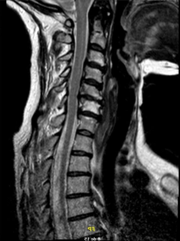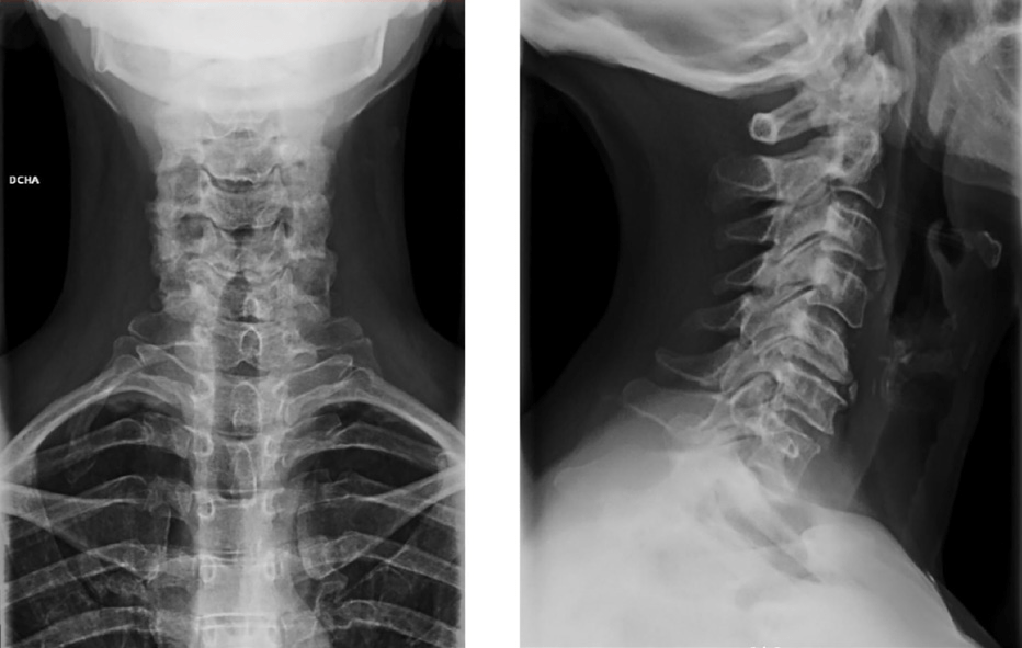 - RMN: discopatía cervical grave C4-C7, especialmente crítica en C5-C6 sin alteraciones de señal medular.