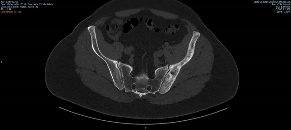 Se solicita RM, TC y gammagrafía observándose una lesión en pala ilíaca izquierda compatible con Paget y signos de sacroileítis bilateral, sin recidivas herniarias ni fibrosis. Se aprecia además aflojamiento de tornillos de L5 bilateral más derecho.
