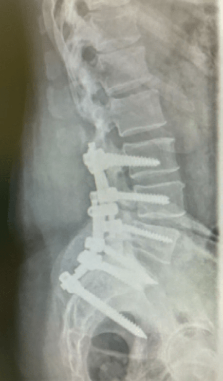 Se inicia tratamiento farmacológico para Paget sin mejoría. Se realizan infiltraciones y radiofrecuencia en sacroilíaca izquierda con mejoría inicial poco duradera. Se decide cirugía: ampliación a ilíacos y retirada de tornillo de L5 derecho aflojado.