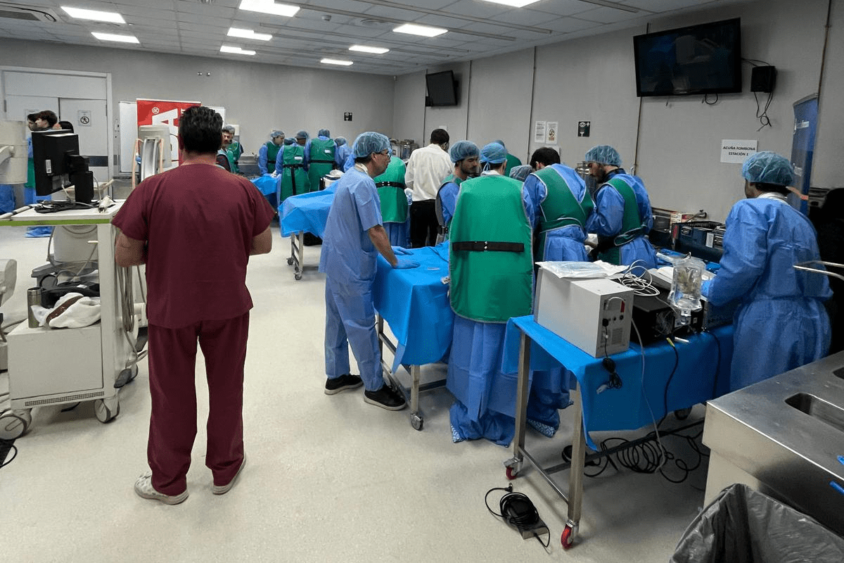 La parte práctica se desarrolló en la Universidad Francisco de Vitoria, donde los asistentes trabajaron en estaciones específicas dedicadas a osteotomías, vertebrectomías en bloque, sacrectomías, abordajes laterales y técnicas como la toracofrenolumbotomía, siempre bajo supervisión directa.